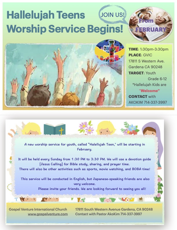 そして、こちらも同じく2月から「ハレルヤティーン」Youth対象(中高生)の礼拝が始まります。毎日曜日午後1時半から3時半まで、英語を中心に行いますが、日本語のティーンズも大歓迎です。ずっとユースのミニストリーを祈り、考え、模索してきました。冒頭の御言葉は私がサンデースクール(今はハレルヤキッズと呼ぶ)を担当していた時に、・・【つづきを読む】